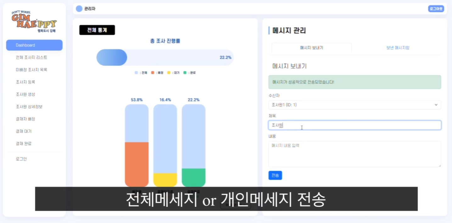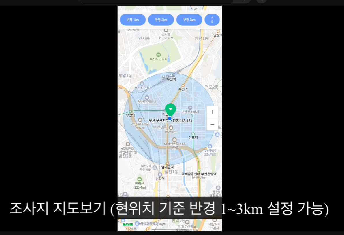 AR기능ㆍ지도활용 마커 / 반경거리ㆍAPI활용ㆍ실태조사ㆍ결과 임시저장/제출ㆍ결재 승인/반려ㆍ통계관리ㆍ사용자관리ㆍ결과보고서 PDF 다운로드ㆍ등 웹/앱 통합 기능 구현.
